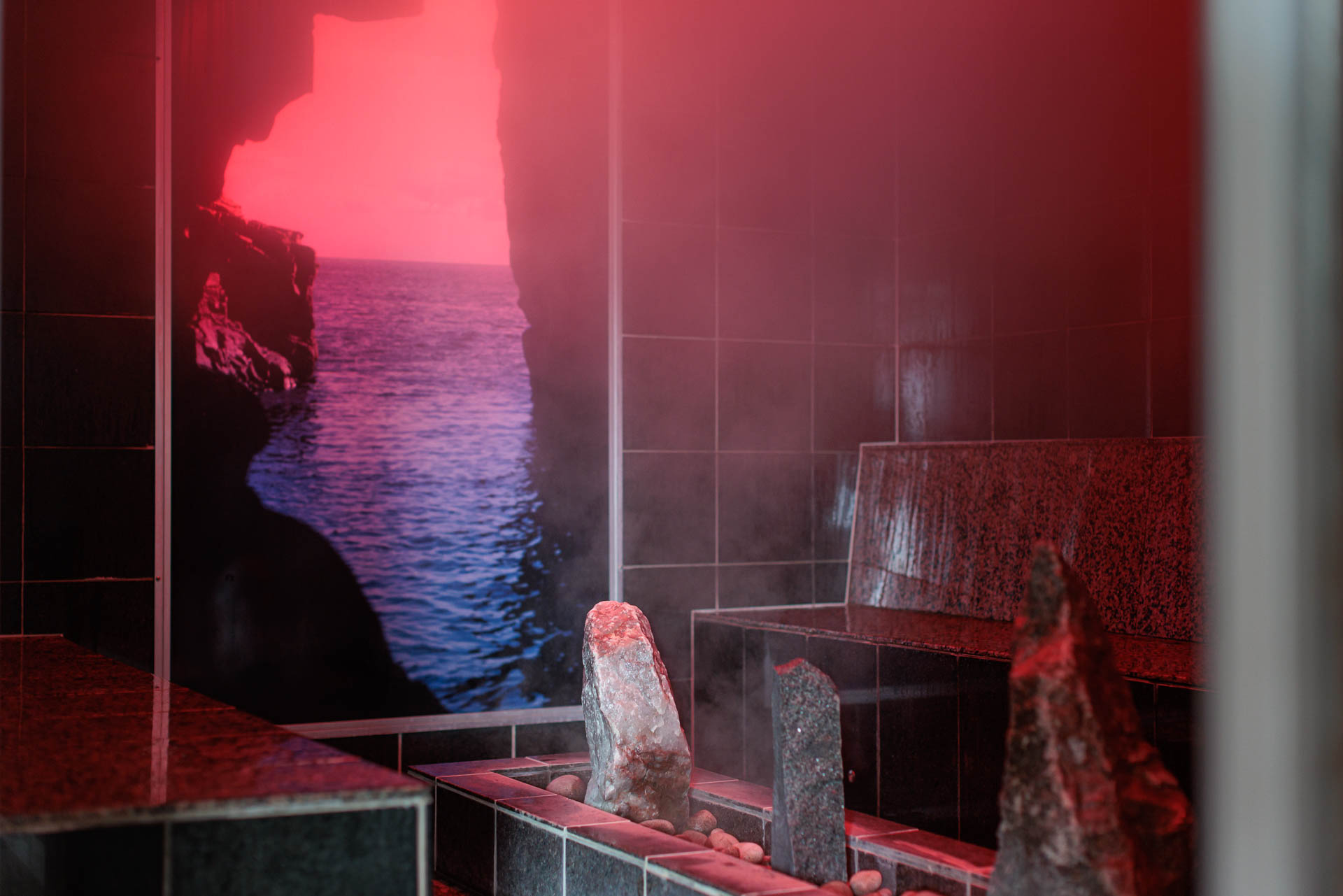 Stil dig foran vandfaldet, træk i rebet og lad kaskader af vand plaske ned over ryg og nakke. Spændinger i nakke og skuldre blødes op, når strømme af lunt vand fosser ned over hals og hoved. I midten af bassinet presser den underjordiske geyser blidt vandet mod dine fødder. Fortsæt videre til de bølgeformede liggebænke i spabadet, og slap af, mens du nyder stjernehimlen i loftet.